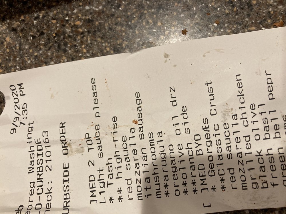 Our classic dough with shredded mozzarella, oregano, chopped garlic, pesto drizzle, two sides of red sauce